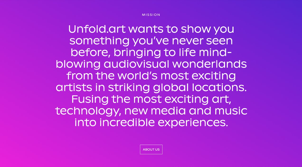 Unfold.art wants to show you something you’ve never seen before, bringing to life mind-blowing audiovisual wonderlands from the world’s most exciting artists in striking global locations. Fusing the most exciting art, technology, new media and music into incredible experiences.